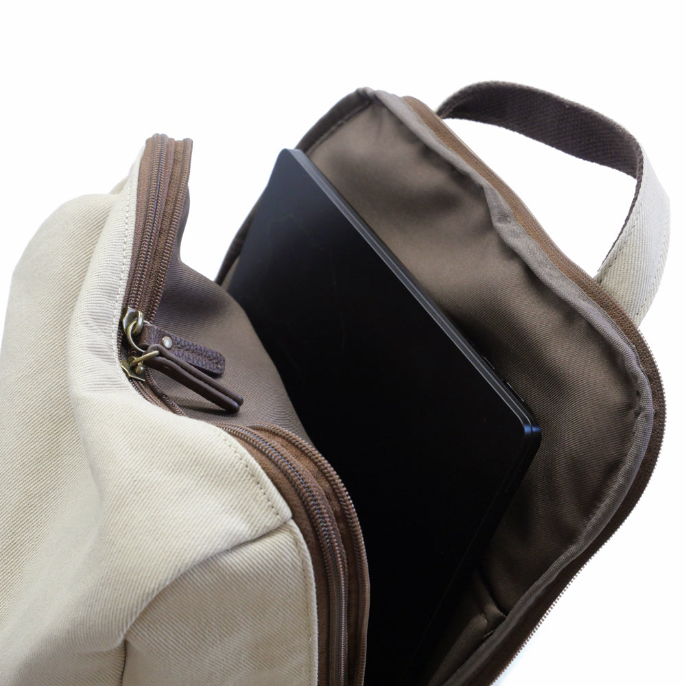 がばっと開くメイン収納+ファイルも入る緩衝材入りPC収納は機能的なのにスマート、14インチまでのPC収納が可能です。オンオフで使いやすい春の大人リュックです。