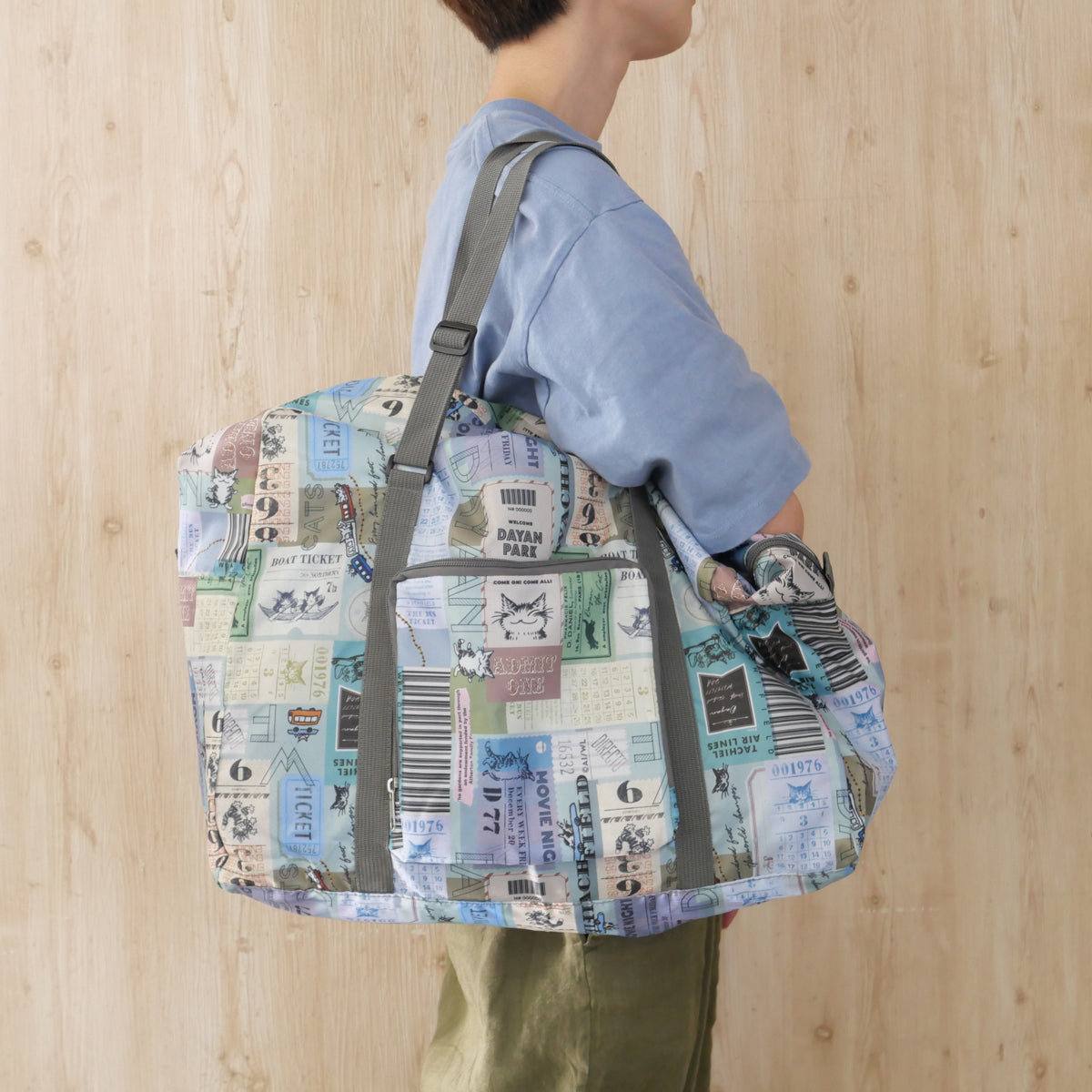 たたんで持ち運べるポケッタブルボストンバッグ。正面のファスナーポケット裏が空洞になっていてキャリーバーを通せます。